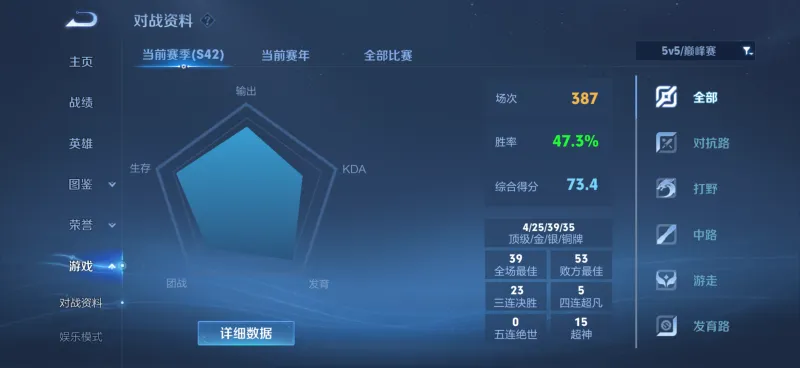 新赛季排位胜率奔着30去了,作为一个销售压力很大,游戏里还总被队友压力,感觉快抑郁了,巅峰赛相比就好打多了,和上赛季胜率一样,仅仅几十把就到了1400,胜率47也是和上赛季一样,考虑新赛季强度大,我这赛季已经是进步了,争取100场内打到1450,突破自我。